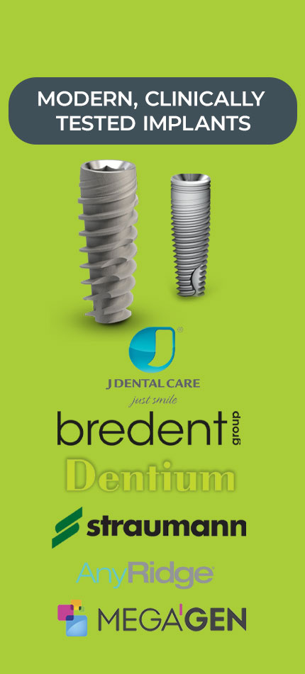 | Implantology | Dental implants from Straumann (Switzerland), Bredent (Germany), Dentium (Korea), and JD Evolution (Italy). Safe and precise implant placement with warranty, even in complex cases. |