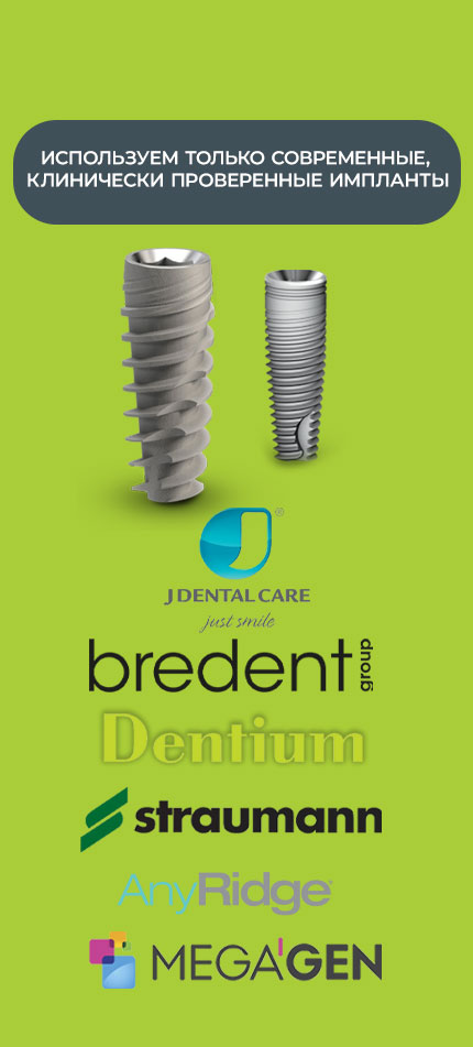 | Имплантология | Импланты Straumann (Швейцария), Bredent (Германия), Dentium (Корея), JD Evolution (Италия). Установка зубных имплантов с гарантией, в том числе сложные случаи (зигоматические, птеригойдные). |